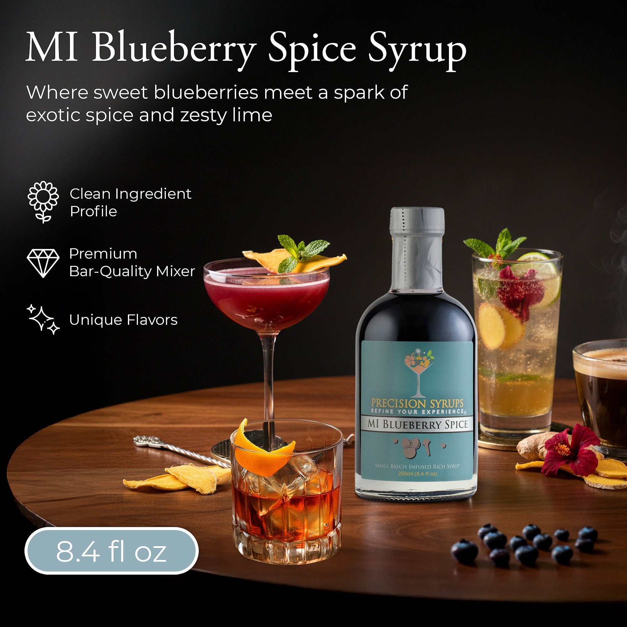 Introducing our Infused Rich MI Blueberry Spice Syrup, a symphony of flavors in every bottle. Immerse yourself in the essence of the finest blueberries, complemented by the exotic touch of Dried Persian Limes. This exquisite infusion is elevated with the bold notes of black peppercorns and the warmth of allspice, creating a sensory journey that captivates your taste buds. Versatile and indulgent, this syrup adds a burst of unique flavor to beverages, desserts, and culinary creations. Elevate your culinary experience with the perfect balance of sweetness and spice.